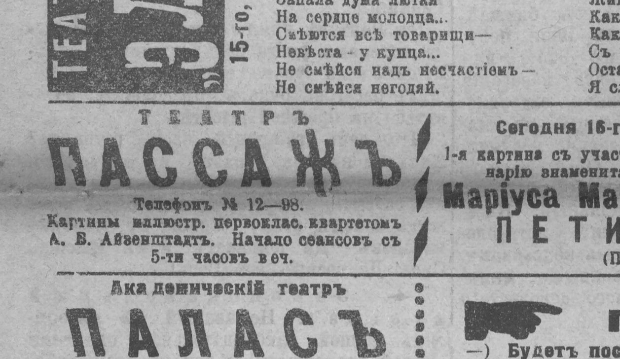 Были в Пассаже и развлекательные заведения. В начале ХХ века в городских газетах активно рекламируется театр "Пассаж": "Картины иллюстрированные первоклассным квартетом. Начало сеансов с 5 часов вечера":